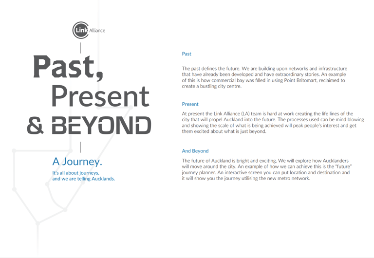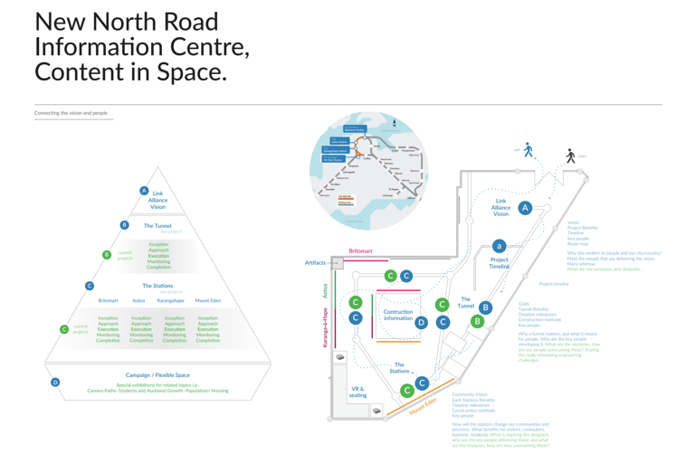 I was tasked with creating an engaging, informative and on-budget visitor centre for the City Rail Link (CRL). The purpose was to inform the community about the project and build excitement around Auckland’s future. To achieve this, an immersive visitor experience was designed, housing artefacts and interactive models. The space was structured to make information easy to digest and to create memorable storytelling moments for visitors.